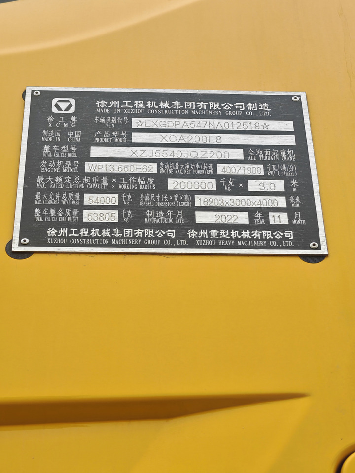 Sprawdzić informacje techniczne na temat elementów wyposażenia z katalogu XCMG XCA200 Żuraw szosowo-terenowy.